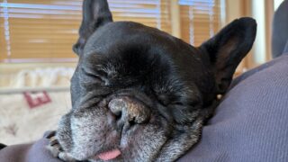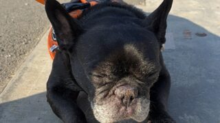 油断するとグズグズになってしまう、フレブル八朔くんの鼻。内藤石けん教室から生まれた「フレブルはだやか 鼻クリーム」で、毎日ケアを頑張っています。目指すは、黒くピカピカに輝く健康な鼻です!