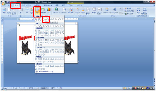 [挿入]タブ→[図形]→[正方形/長方形]をクリックします。
