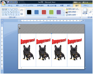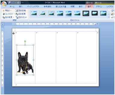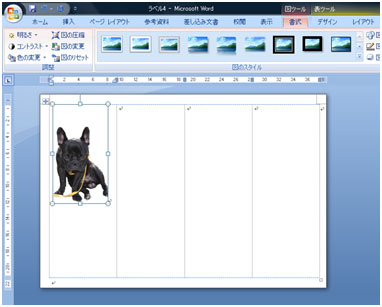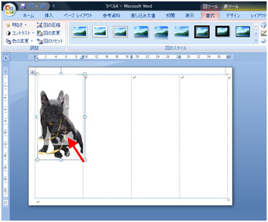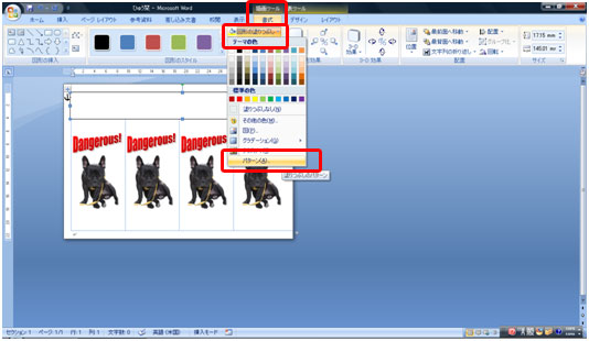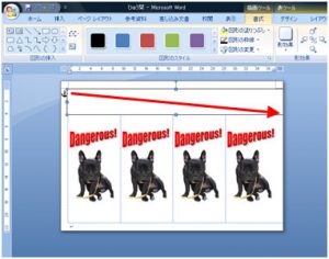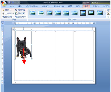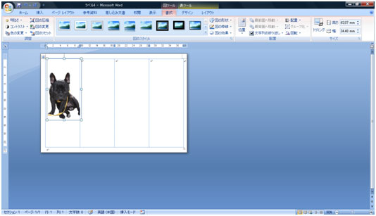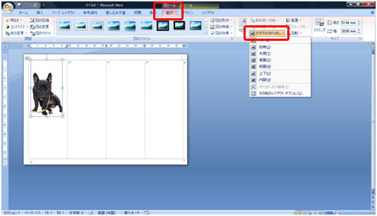 写真を好きな位置に移動します。 写真を選択し[書式]タブ→[文字列の折り返し]ボタン→[前面]をクリックします。