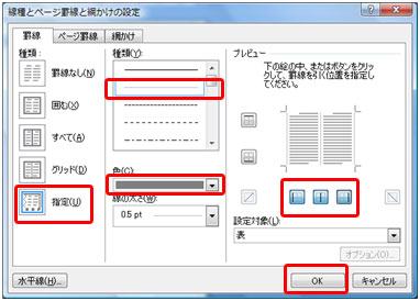 種類[指定]、罫線の種類[点線]、罫線の色[灰色]に設定し左縦罫線、中央縦罫線、右縦罫線を指定して[OK]ボタンをクリックします。