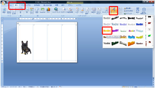 ワードアートで飾り文字を作ります。[挿入]→[ワードアート]をクリックし好みのスタイルをクリックします。