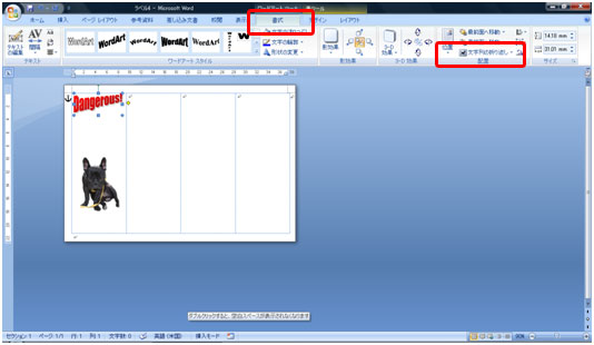 ワードアートを移動します。[書式]タブ→[文字の折り返し]→[前面]をクリックします。