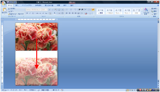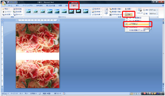 2つ折りにした際に写真の向きが正しくなるように、上の写真を上下反転します。 写真を選択し[書式]タブ→[回転]ボタン→[上下反転]をクリックします。