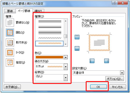 罫線の種類、色、太さなどを設定し[OK]ボタンをクリックします。