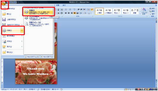 はがきにフチなし全面印刷します。[Office]ボタン→印刷→印刷をクリックします。