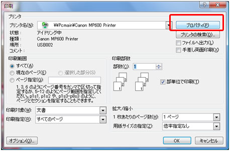 ※プリンタの種類によってプロパティの画面が異なります。 フチなし印刷に対応していない機種もあります。