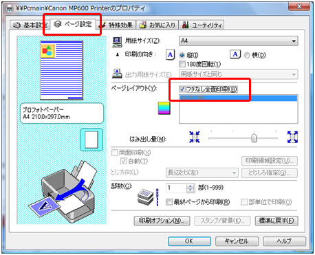 [ページ設定]タブ→[フチなし全面印刷]をチェックし[OK]ボタンをクリックします。