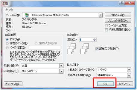 印刷ダイアログボックスに戻ります。[OK]ボタンをクリックすると印刷が始まります。