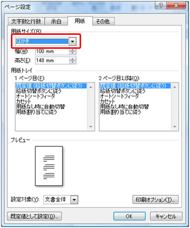 用紙サイズ[はがき]を選択します。