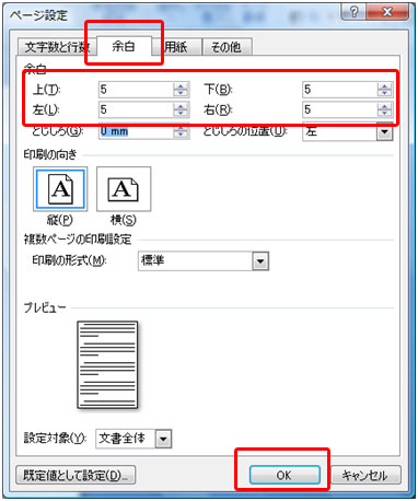 [余白]タブをクリックし、上下左右の余白を5mmにします。[OK]ボタンをクリックします。