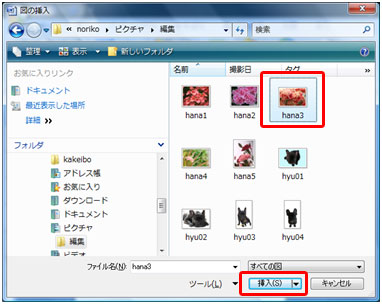 挿入したい写真を選択し[挿入]ボタンをクリックします。