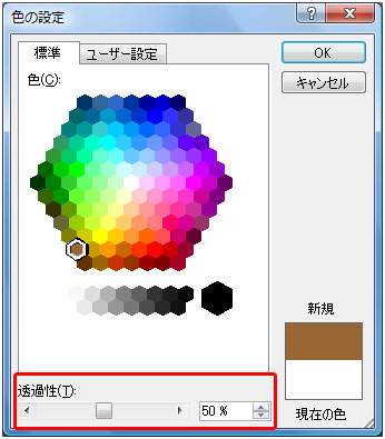 [その他の色]を選択すると、たくさんの色から選択できます。 また、透過性を50%に設定すると半透明にできます。