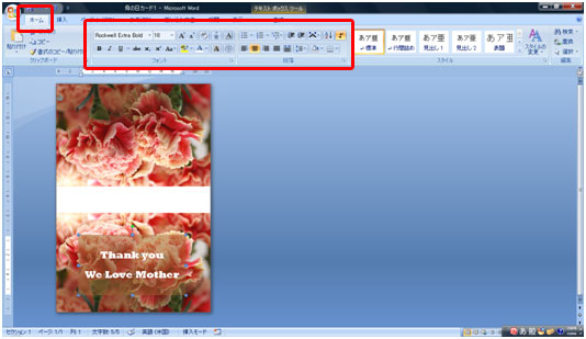 [ホーム]タブをクリックし、文字のフォント、色、サイズ、配置を変更します。
