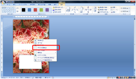写真を選択し[書式]タブ→[文字列の折り返し]→[前面]をクリックします。
